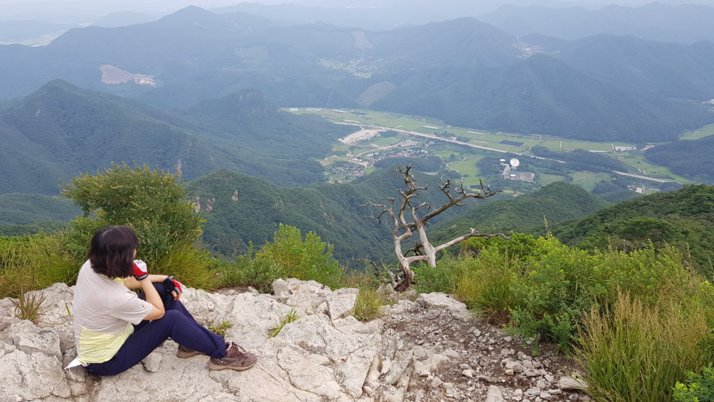 ↑ 구병산 정상에서 바라보이는 적암리 마을. 청주~상주 간 고속도로가 초록의 논밭 사이를 질주하고 있다. 고사목 바로 뒤 계곡이 숨은골이다.