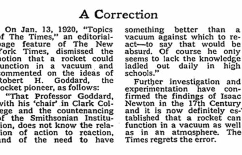 ↑ 1969년 7월 17일자 뉴욕 타임스에 실린 ‘A Correction’이라는 제목의 정정기사 훗날 ‘로켓의 아버지’로 불린 로버트 고더드가 1919년 ‘극단고도에 도달하는 기술’이란 제목의 논문을 […]
